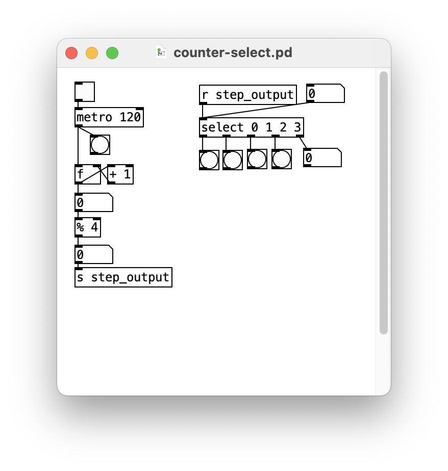 f sets its value but doesn’t send anything to the output.f can receive a bang to spiit out the output.select lets us route different actions based on a number (like switch in many programming languages)(one more trick here: s and r)